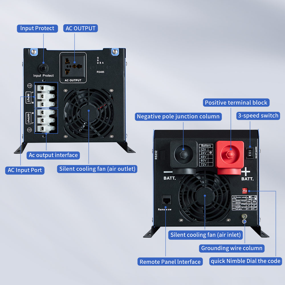 ● 12V 24V 48V1KW-3KW Power frequency sine wave inverter: 7 Mga mode ng Paggawa, sa Mains \ Solar \ energy-save mode, lahat ay may walang pag-iingat, generator, backlight at output mode na nababagay kung kinakailangan; bagong status display bar, self-check fault, i-restart ang pag-andar;